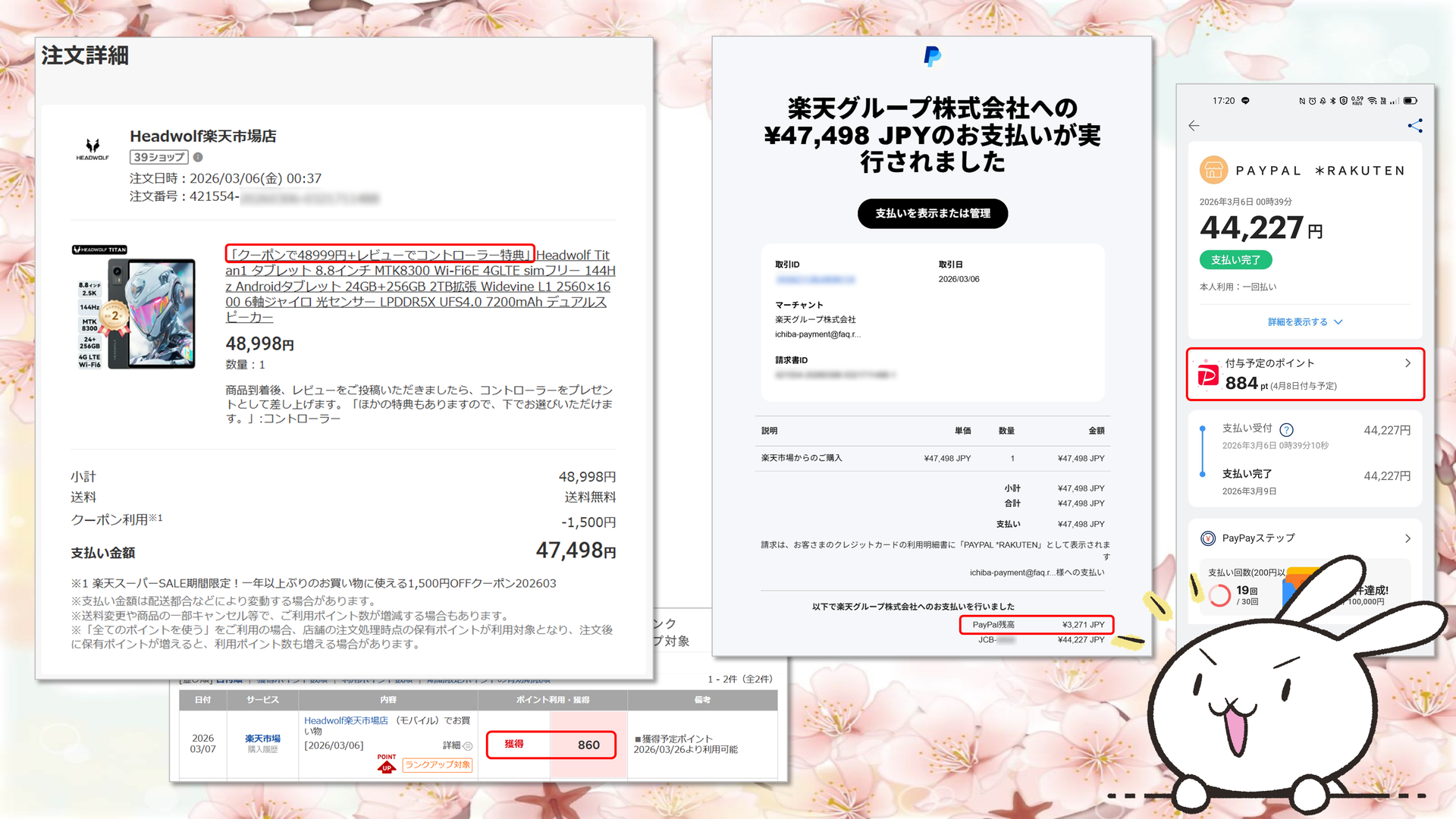 • 残額を PayPay カードで支払い → PayPayポイント+楽天ポイント 合計:約1,700円相当